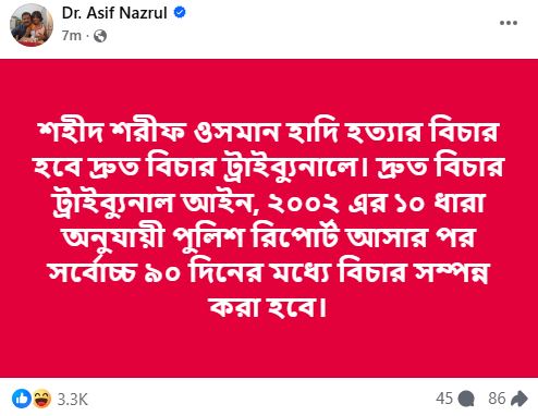 পোস্টে আইন উপদেষ্টা লিখেছেন, ‘শহিদ শরিফ ওসমান হাদি হত্যার বিচার হবে দ্রুত বিচার ট্রাইব্যুনালে। দ্রুত বিচার ট্রাইব্যুনাল আইন, ২০০২ এর ১০ ধারা অনুযায়ী পুলিশ রিপোর্ট আসার পর সর্বোচ্চ ৯০ দিনের মধ্যে বিচার সম্পন্ন করা হবে।’