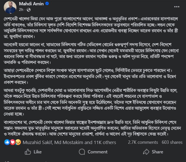 মাহাদী আমীন তার পোস্টে বলেন, বেগম খালেদা জিয়া বর্তমানে রাজধানীর এভারকেয়ার হাসপাতালে ভর্তি থাকলেও তার চিকিৎসা পরিচালিত হচ্ছে দেশি-বিদেশি বিশেষজ্ঞ চিকিৎসকদের সমন্বয়ে। লন্ডন থেকে সার্বক্ষণিকভাবে চিকিৎসকদের সঙ্গে যোগাযোগ রেখে প্রয়োজনীয় দিকনির্দেশনা দিচ্ছেন তারেক রহমান ও তার স্ত্রী খালেদা জিয়ার ব্যক্তিগত চিকিৎসক ডা. জুবাইদা রহমান।